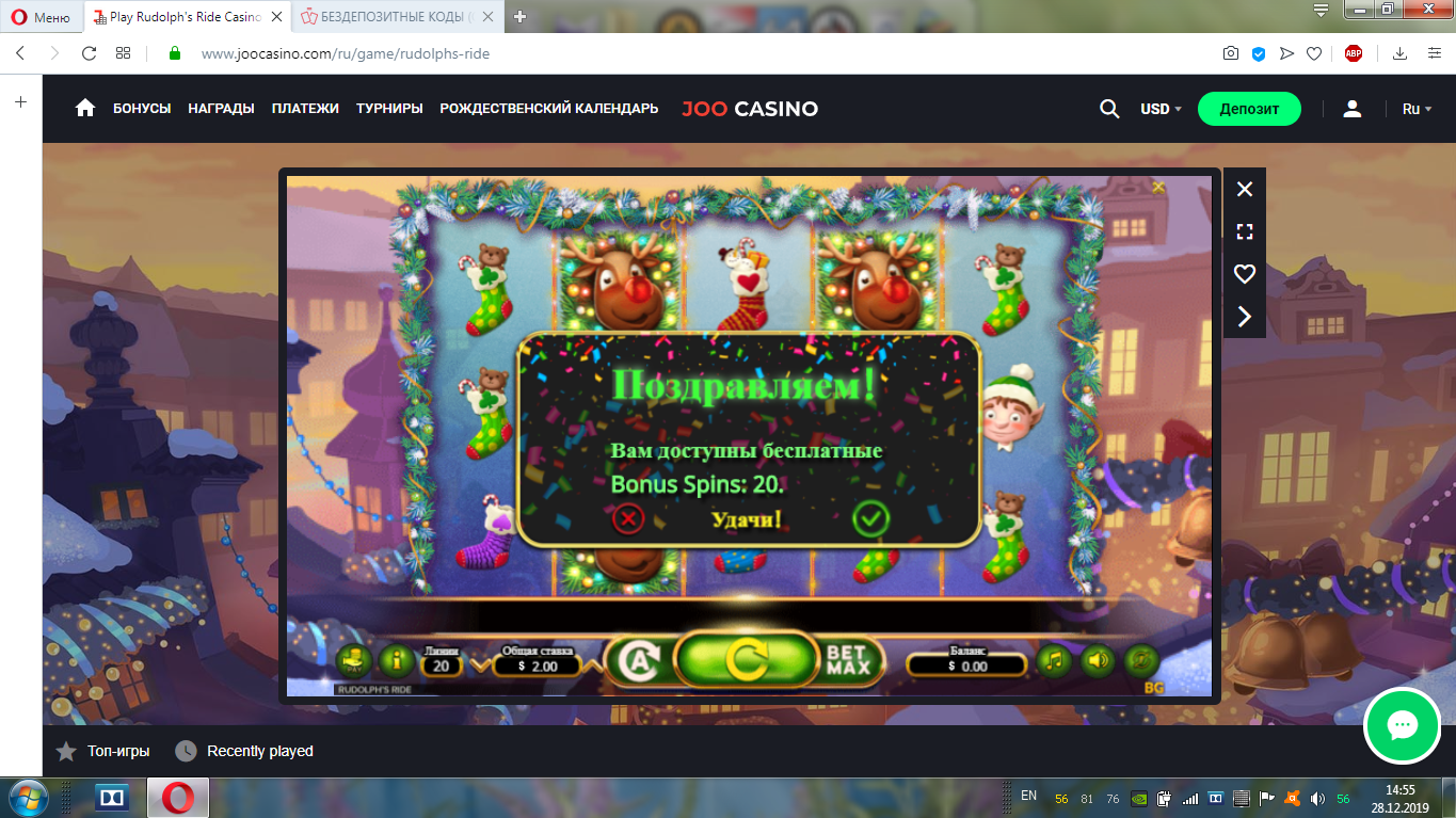 В joocasino можно получить 20 фри спинов в слоте Rudolph`s Ride по коду XMAS28-депов у меня не было