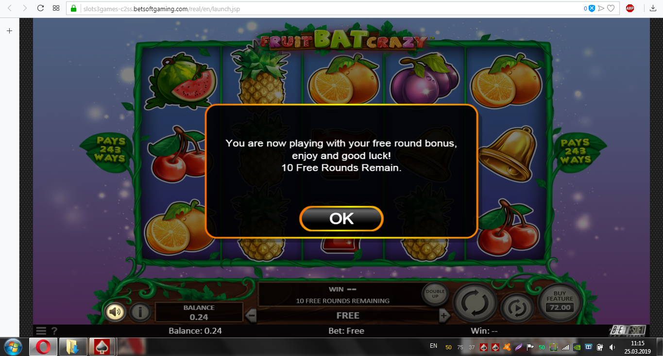 В Intertops Poker в скачиваемой версии 10 фриспинов слот Fruitbat Crazy от Betsoft. Выигрыш с них лег на основной баланс