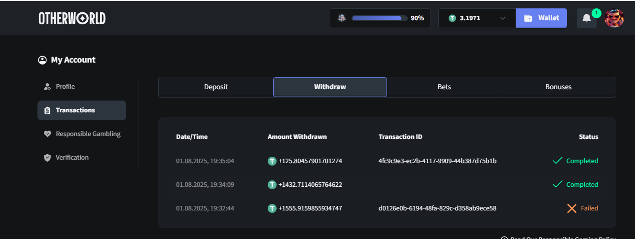 По поводу казино Otherworld, отыграл бонус, прошёл KYC по правам, депнул 10 евро и сразу поставил на вывод, вывели 100 евро + 10 депа