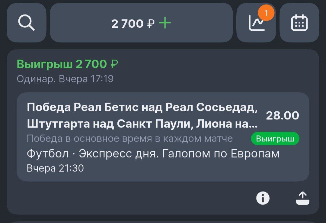 Как то недели 3+- назад был разговор, кто куда ставит сотку от Лиги, я тогда ответил, что на экспрессы, уже готовые от Лиги, вот вчерашнюю так же поставил, конечно редко заходят, но всё же бывает)