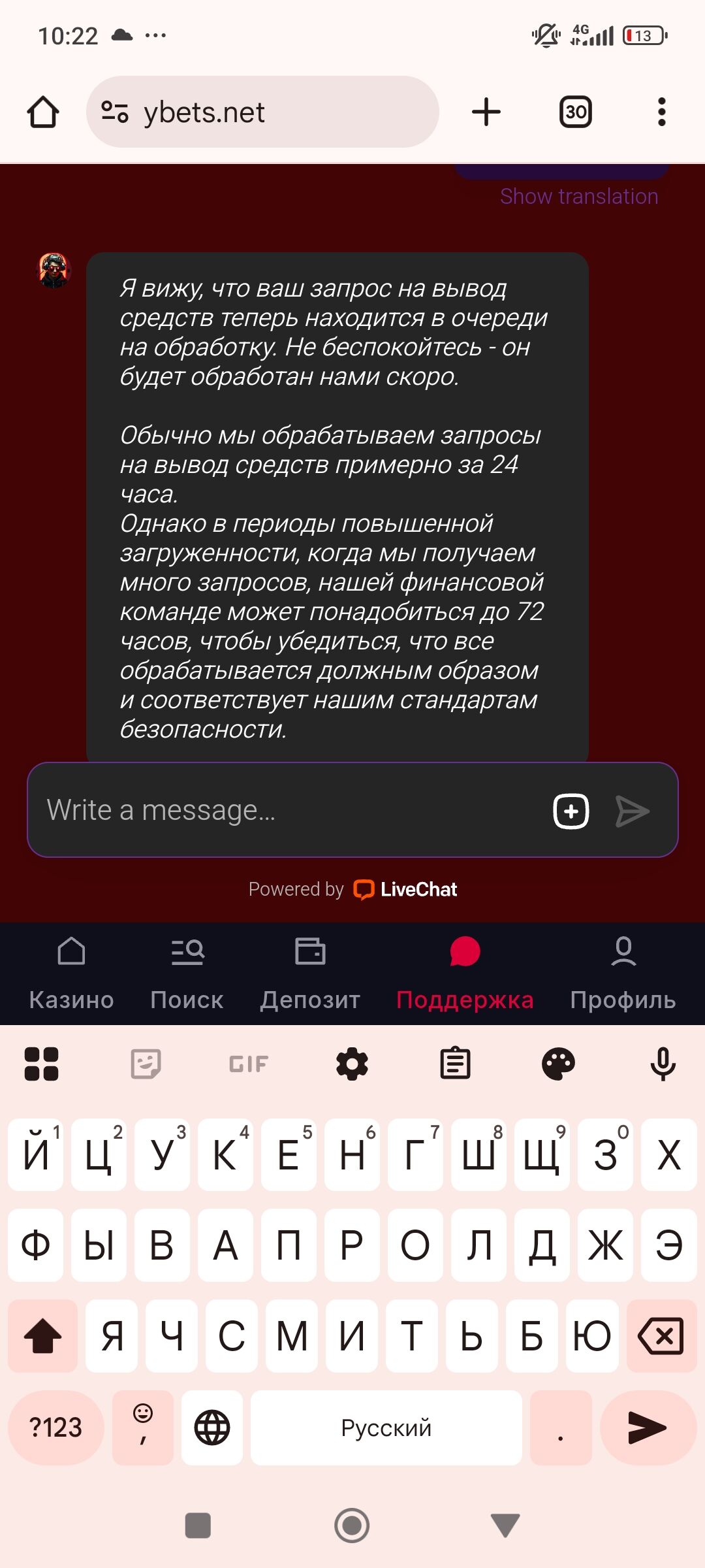 Ybets вывели без верефикации, в 9 утра ставил в два ночь деньги пришли