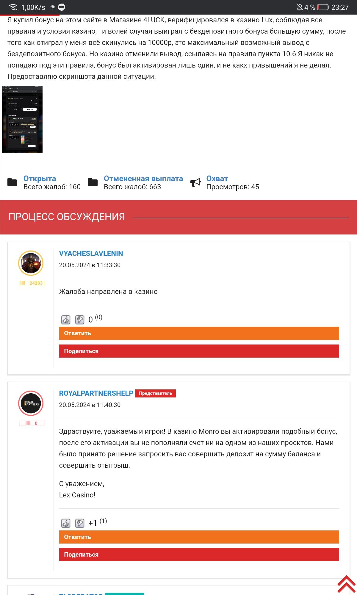 Я и бонус отиграл давно, его скинули на 10000р, а после мурыжат уже которой день, ссылаясь на то что я в другом каком-то казино получил бездепозитный бонус и по этому не выводят. Жалоба моя закрывается сегодня ознакомьтесь как нашего брата дурят. Они имеют с нас огромные деньги, а когда кто-то выиграл, ищут возможность их не платить, и я немного понимаю что необходимо быть осторожным с клиеньурой казино, но не могу понять почему пытаются, отжать даже честный выигрыши с бездепозитов. Они вроде не бомжи, которые хостинг с рекламой используют.