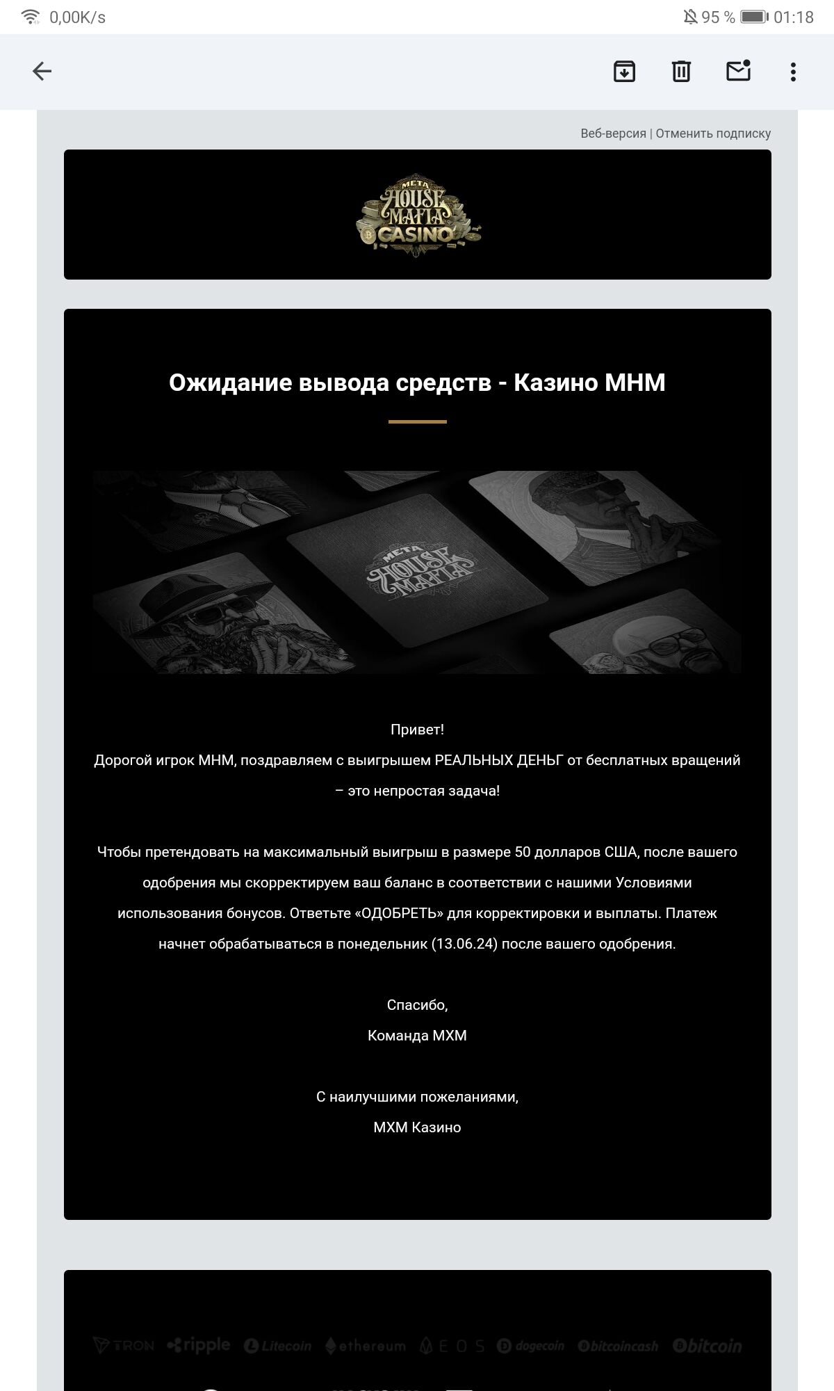 Говорю как есть: Зарегистрировался там, получил 20фс, уже не помню какой вэйджер был, но отиграл и баланс был около 100usd, поправилам они выводят с бездепа только 50usd, так что я поставил 50$ на вывод, через btc кошелёк, остальные промотал в разных играх. После двух недель ожидания, я уже не надеялся на то что этот сайт что либо выводит… Но тут пришло письмо (смотрите скрин), и после подтверждения в ответ им высланное, через пару дней пришли биты в размере 50$. Сразу говорю что это фантастика, так что не особо рассчитываете что вам так-же подфортит. Случай один на миллион. А кому выведут напишите мне в ЛК, а то мы тут и так им рекламу устроили.