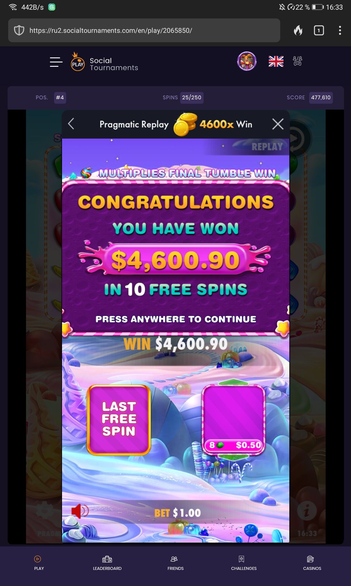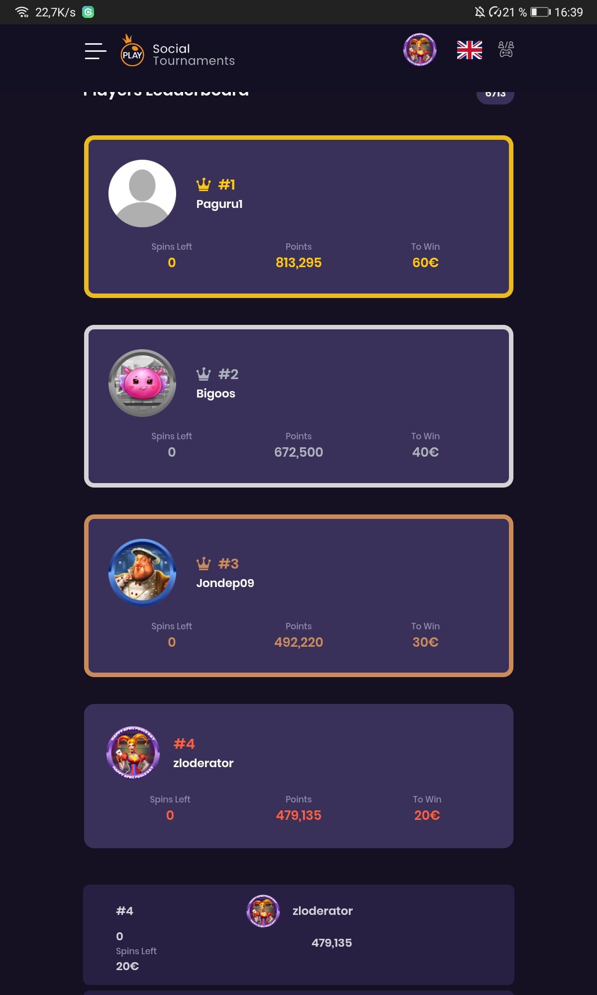 У кого на SocialTournaments com, были последний раз выигрыши? Я уже турниров 300 без результата покрутил. в общей сложности вывели 100€. Причём я выигрывал чаше всего до верификации